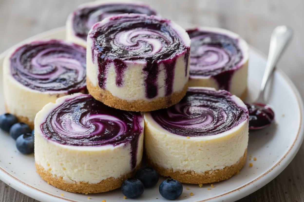 - Evenly distribute the cheesecake filling between the 14 cavities of the muffin pans. Next, evenly distribute the blueberry swirl mixture on top of each cheesecake (about 1 teaspoon or so per cheesecake). Use a toothpick or knife to gently swirl the blueberry mixture into the cheesecake filling.