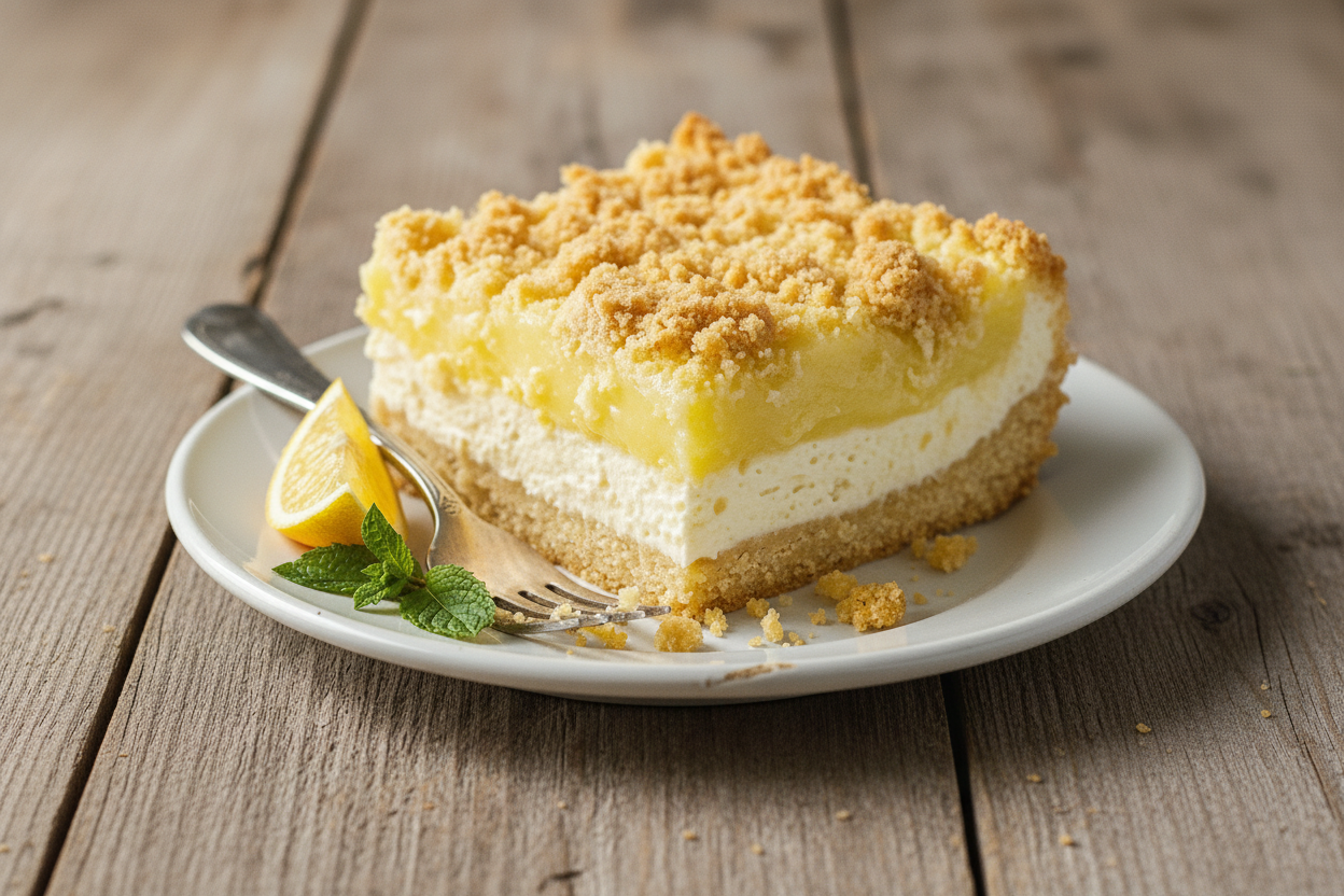 A lusciously easy dessert with a creamy lemon and cream cheese layer topped with a golden, crumbly cake mix crust.