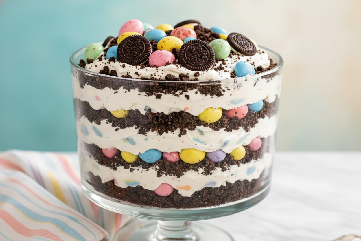 First, make a crust from crushed Oreos. Then, mix a creamy filling with cream cheese and pudding. Finally, top it with more crumbs and pastel candies. The key is layering each part carefully. Chill it well so every slice is perfect. It is a simple, no-bake treat the whole family will love.
