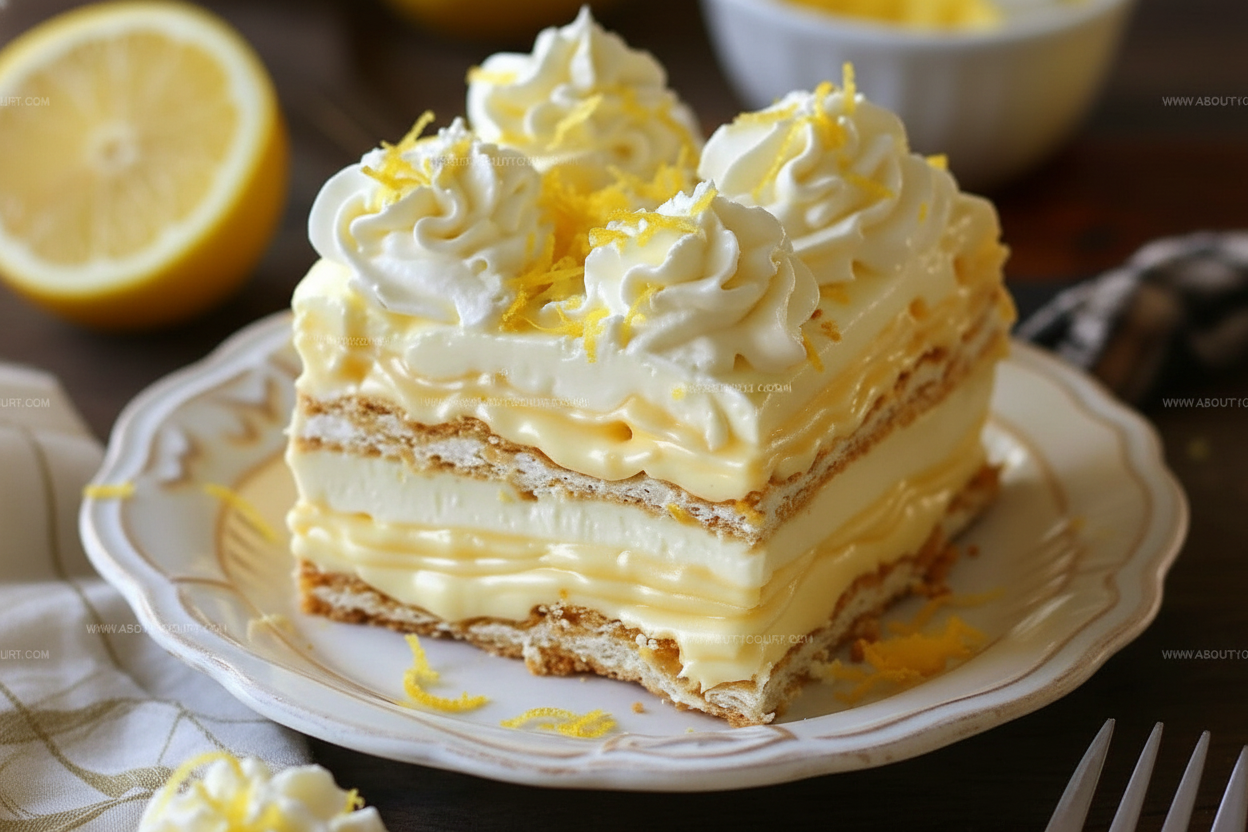 A no-bake, creamy, and refreshing dessert with layers of lemon pudding, whipped cream, and graham crackers that meld together overnight.