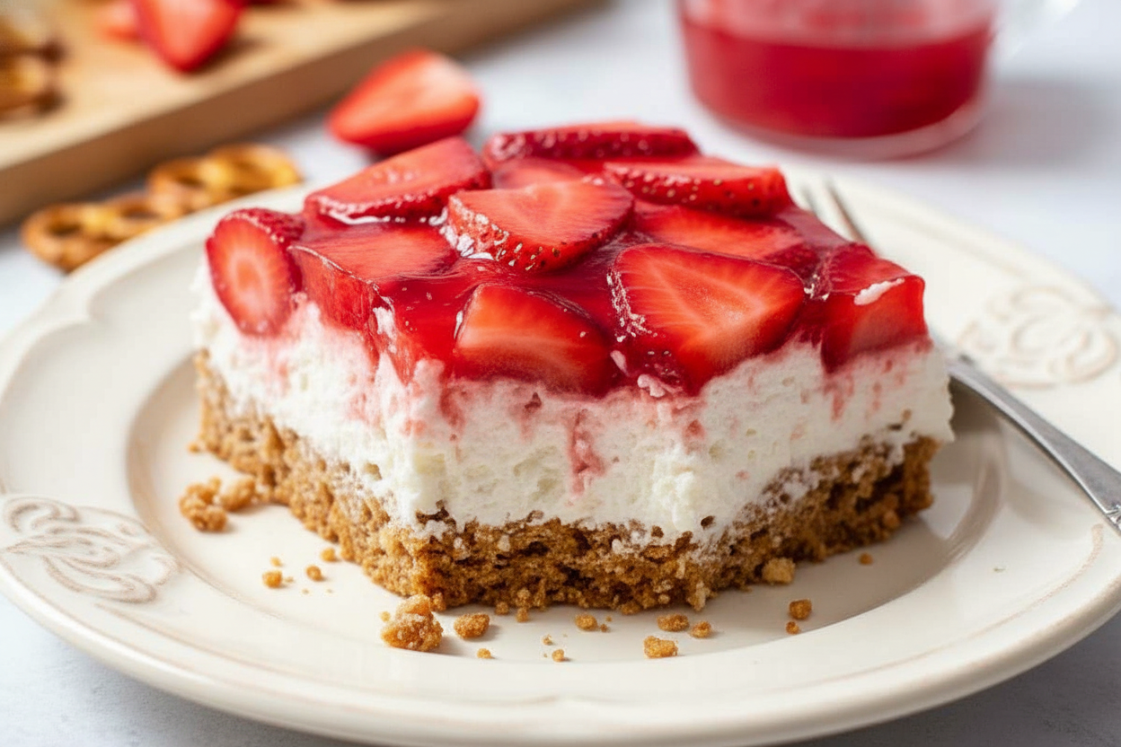 A classic layered dessert with a salty-sweet pretzel crust, creamy cheesecake filling, and fresh strawberry Jell-O topping.