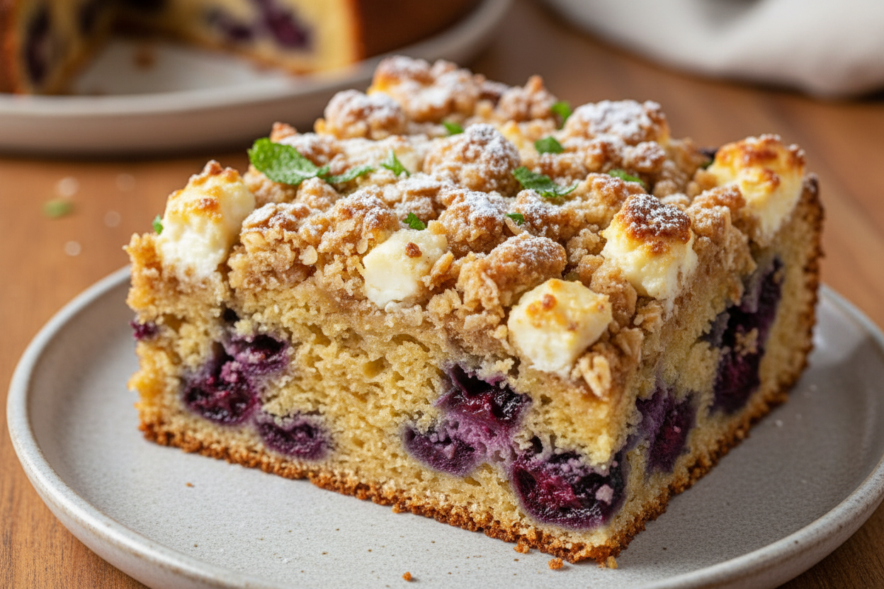 A moist and tender blueberry cake topped with a sweet, crumbly cinnamon streusel, perfect for breakfast or brunch.