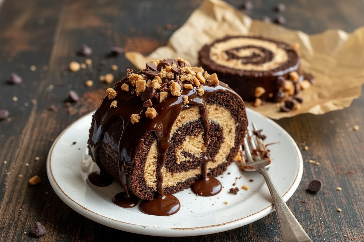 A decadent dessert featuring a light chocolate sponge cake rolled with a creamy peanut butter and peanut butter cup filling, finished with a rich chocolate ganache.