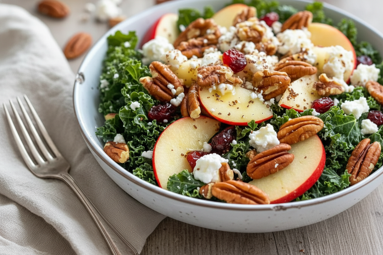 A vibrant and hearty salad featuring tender massaged kale, crisp apple, toasted pecans, tangy feta, and sweet cranberries, all tossed in a simple honey-apple cider vinaigrette.