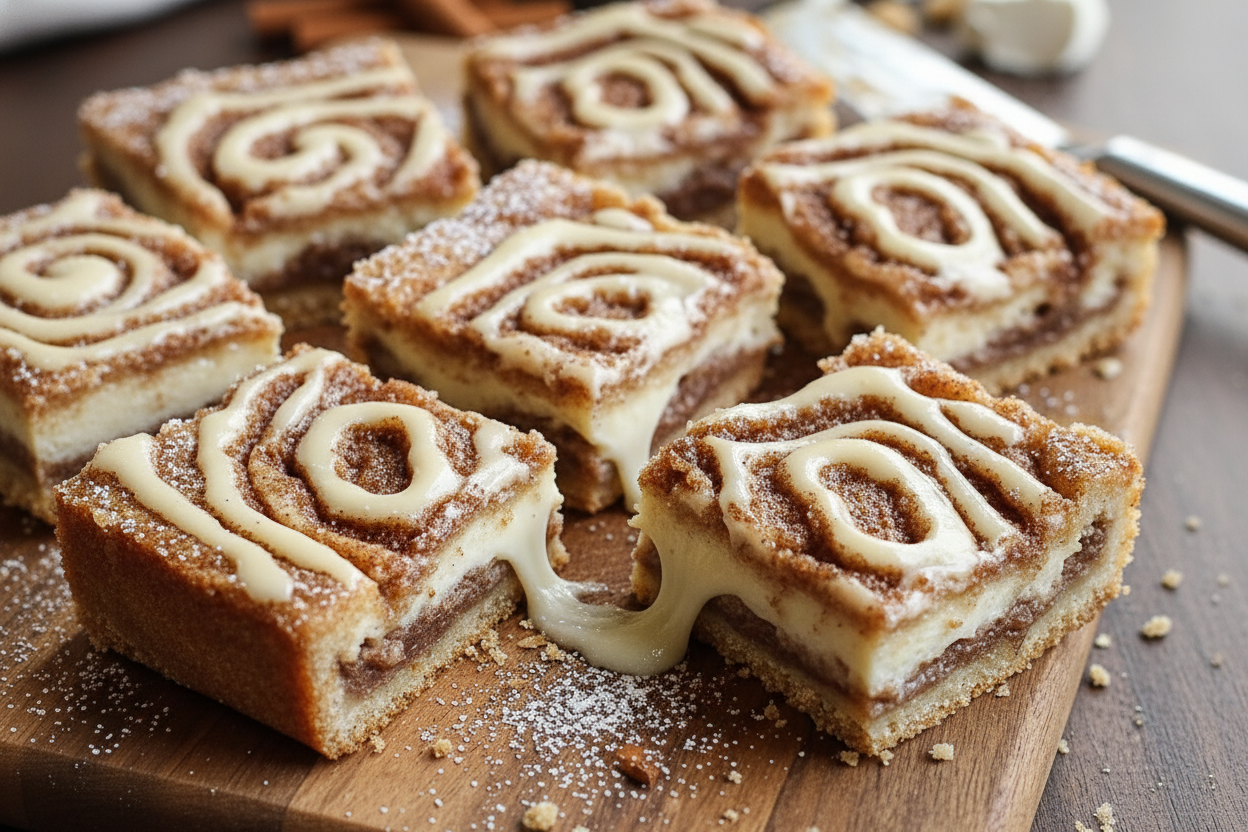 Indulge in these irresistible bars featuring a soft, buttery base swirled with a gooey cinnamon-sugar filling, all topped with a rich cream cheese frosting.