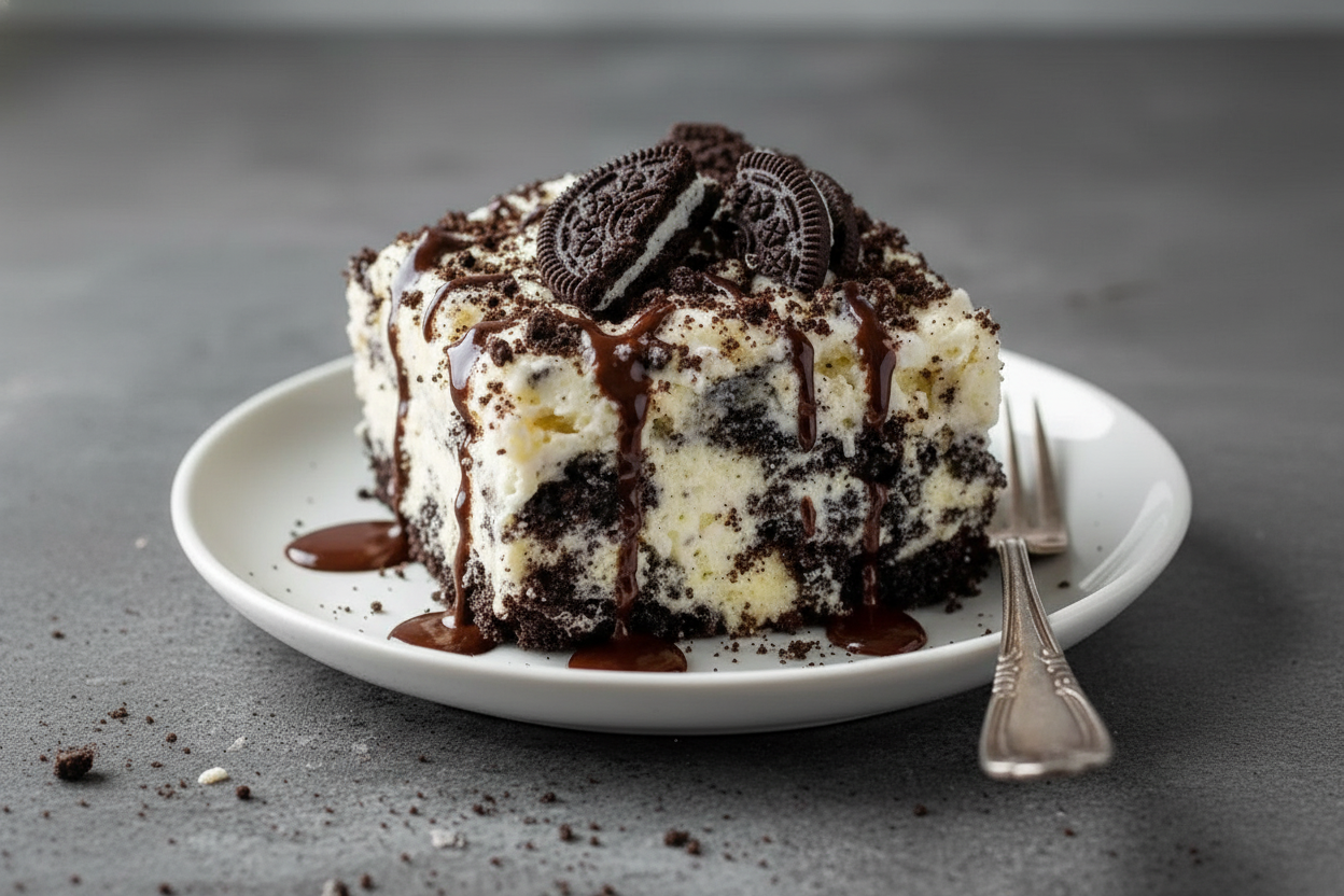 Indulge in the ultimate easy dessert with this Gooey Oreo Chocolate Slab Cake, featuring layers of crushed Oreos, sweetened condensed milk, and cake mix for a rich, fudgy treat.