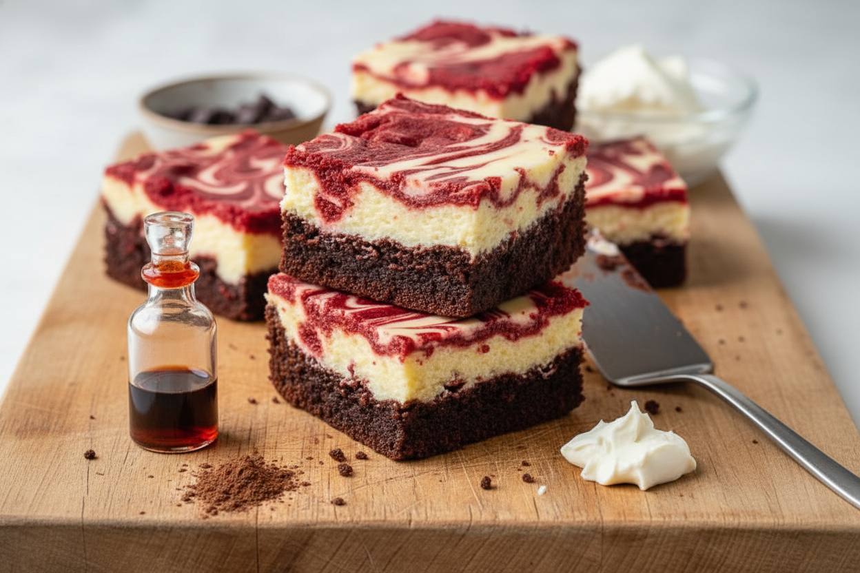 Indulge in the ultimate dessert fusion: rich red velvet brownies swirled with a creamy, tangy cheesecake layer.