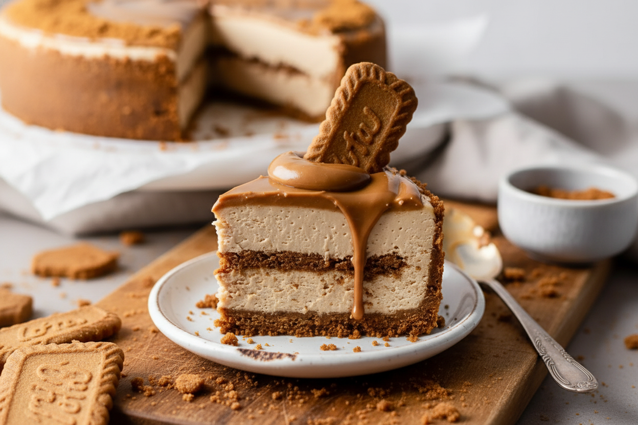 A decadent, no-bake cheesecake with a spiced Biscoff cookie crust, creamy cookie butter filling, and a glossy cookie butter glaze.