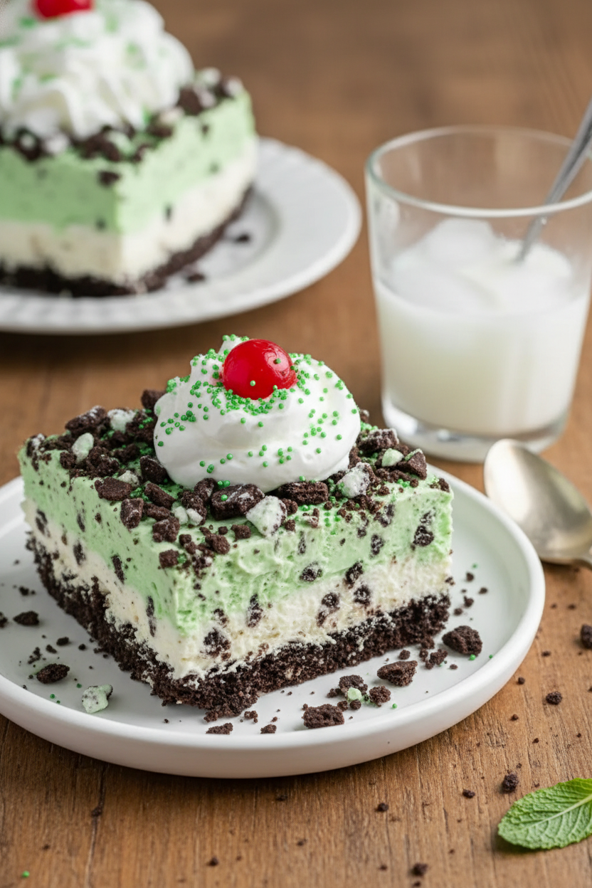 Step 5: Time to serve! Slice it into squares. Top with a dollop of whipped cream. Add a cherry and a pinch of green sprinkles. (A hot knife makes cleaner slices.) I still smile seeing those happy green layers. It’s a sweet little celebration.