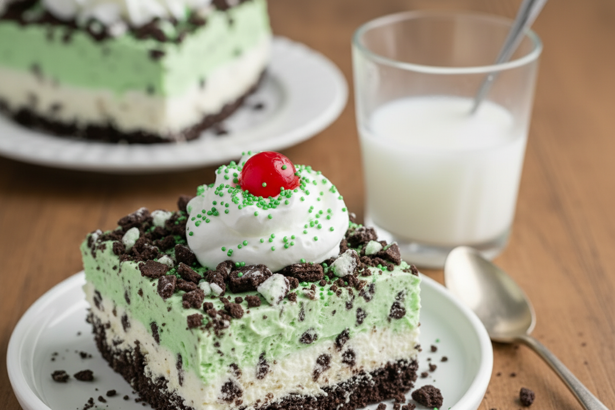 Step 5: Time to serve! Slice it into squares. Top with a dollop of whipped cream. Add a cherry and a pinch of green sprinkles. (A hot knife makes cleaner slices.) I still smile seeing those happy green layers. It’s a sweet little celebration.