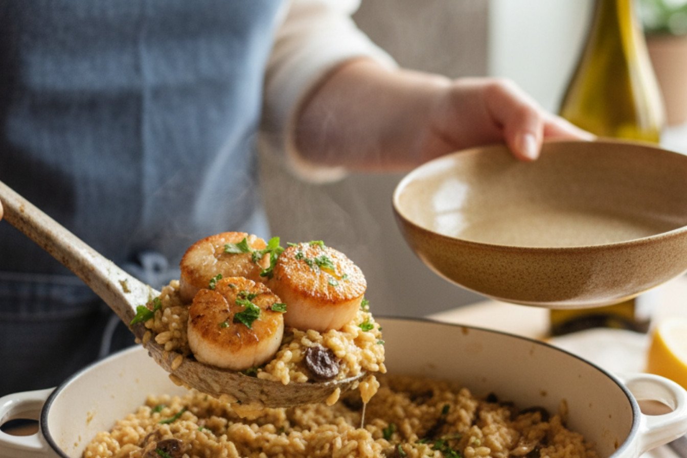 I love a one-pan wonder. It makes a fancy dinner feel simple. You get creamy risotto and golden scallops from one spot. Less washing up means more time to eat.