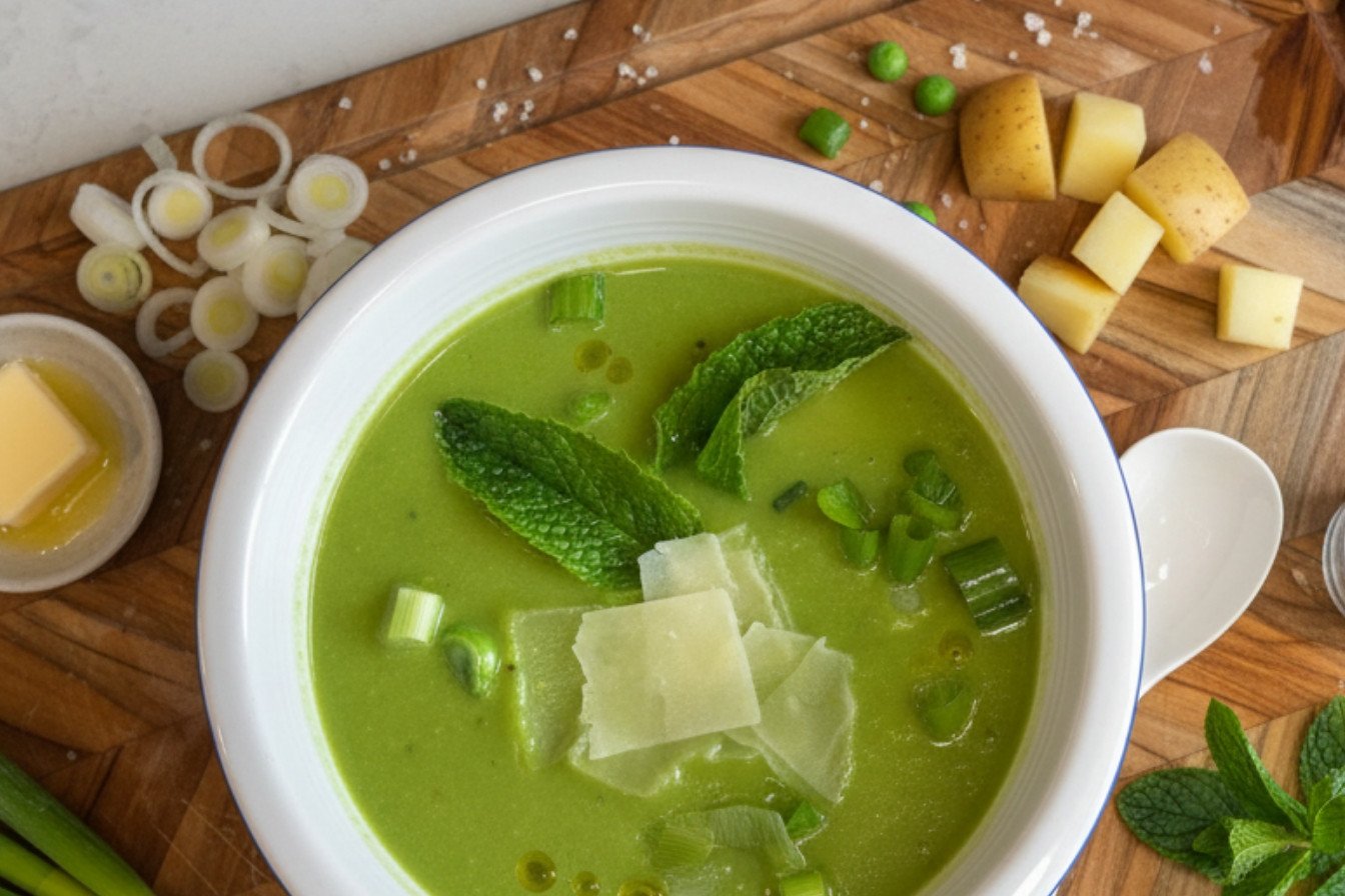 A vibrant and fresh soup blending sweet peas, aromatic mint, and spring onions for a light and flavorful meal.
