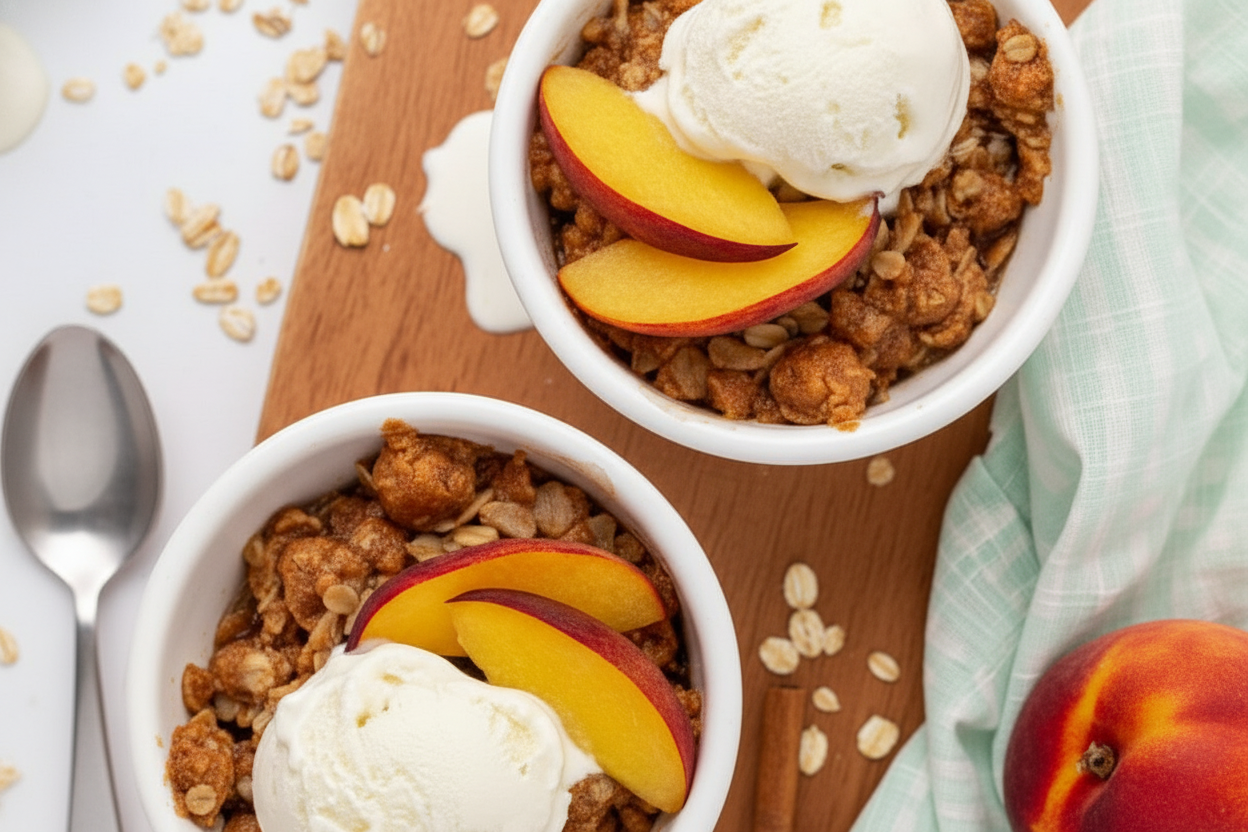 A warm and comforting dessert for two with juicy peaches and a crispy oat topping, perfect for a cozy evening.