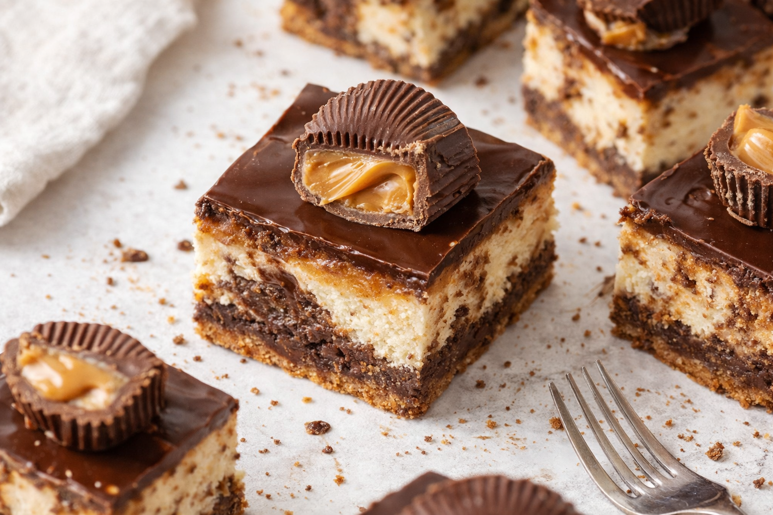 Step 1 Preheat your oven to 325°F. Line a 9×13-inch pan with parchment paper. Spray it lightly with non-stick spray. Set it aside for later. Step 2 Crush graham crackers into fine crumbs. Mix them with sugar and melted butter. Press firmly into the pan. Bake for 10 minutes, then cool. Step 3 Chop 24 Reese’s cups into chunks. Beat cream cheese until smooth. Add sugar, flour, yogurt, vanilla, and salt. Mix well after each addition. Step 4 Add eggs one at a time. Fold in peanut butter cup chunks. Pour over the crust. Bake 40 minutes until edges are set. Step 5 Cool the cheesecake for an hour. Make ganache by melting chocolate, cream, and butter. Stir in powdered sugar. Pour over the cooled bars. Step 6 Top with halved Reese’s cups. Chill for 3 hours or overnight. Cut into 24 squares. Serve and enjoy the rich, creamy goodness. (Hard-learned tip: Freeze the cheesecake for an hour to speed up chilling. No one likes waiting for dessert!) What’s your favorite cheesecake topping? Share below! Cook Time: 55 minutes Total Time: 4 hours 14 minutes Yield: 24 servings Category: Dessert, Bars3 Fun Twists on This Recipe