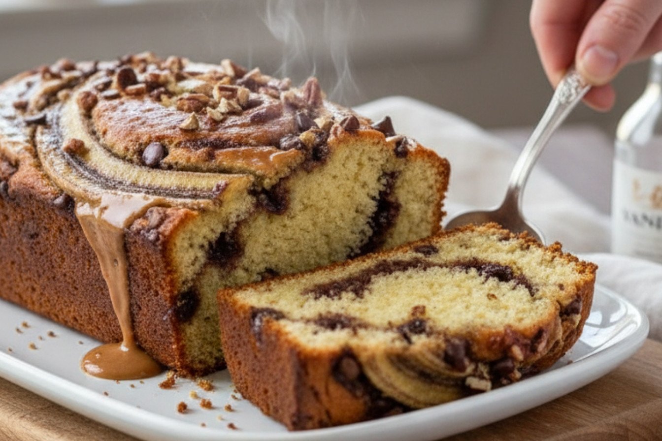 Step 5: Take a knife and swirl the top gently. Just a few figure-eights! Bake for about an hour. Let it cool a bit. Meanwhile, make the pecan praline topping. Melt butter and sugar in a pan. Stir in milk, vanilla, and pecans. Pour this warm sauce over your homemade banana bread. It’s pure magic.