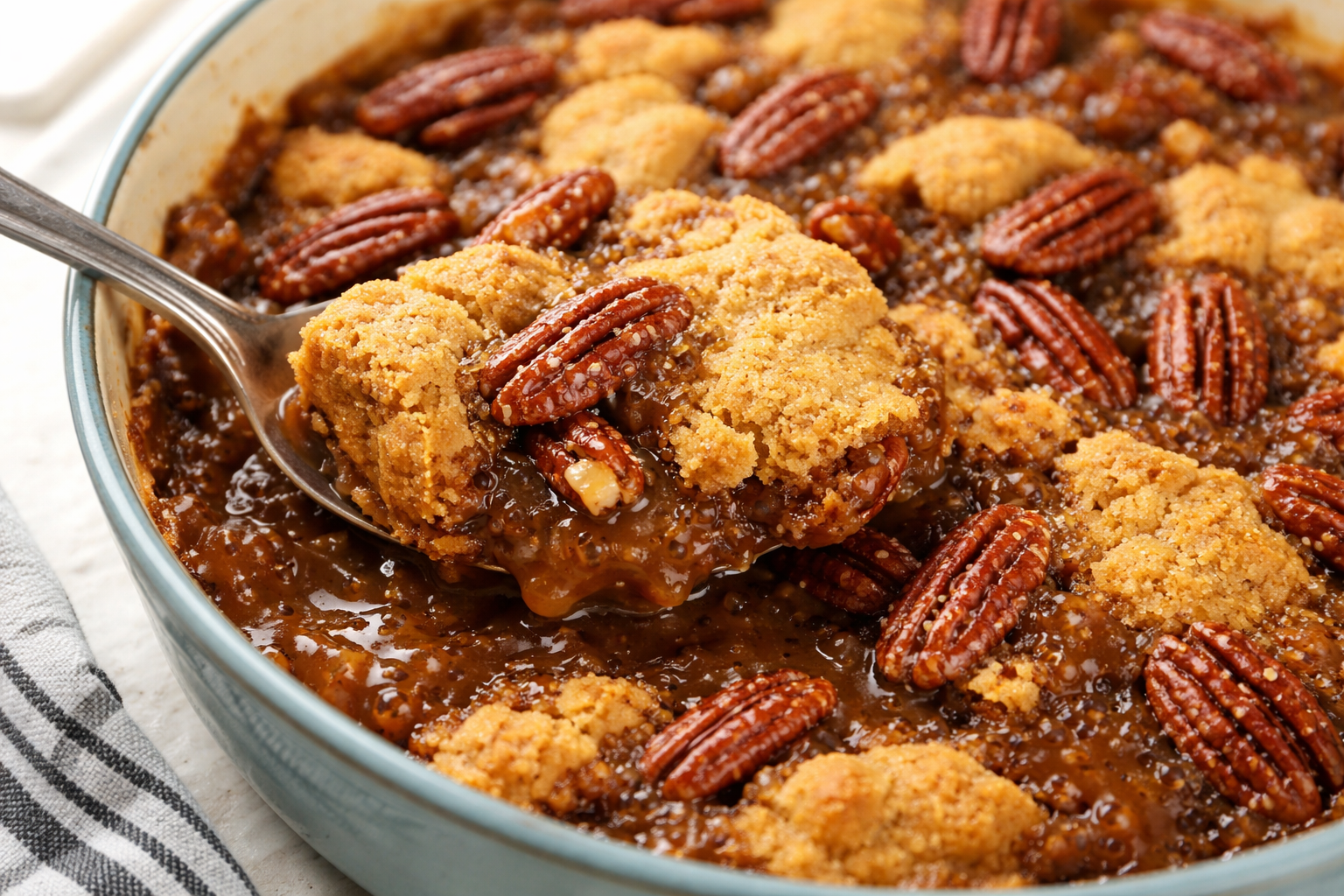 Experience the delightful fusion of pecan pie and cobbler with this rich and gooey dessert.