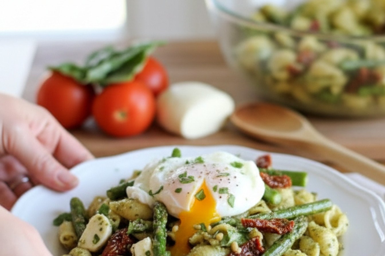 This pesto pasta recipe is simple. Boil your shell pasta. Roast the asparagus with oil, salt, and pepper. Mix the pasta, roasted asparagus, pesto, sun dried tomatoes, and mozzarella in a big bowl. Top each bowl with a freshly fried egg. It’s a complete, delicious vegetarian pasta recipe perfect for any night.