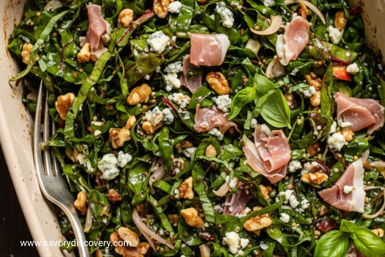 A vibrant and flavorful salad combining tender shredded Swiss chard with salty prosciutto, rich blue cheese, fresh basil, and toasted walnuts in a tangy fig vinaigrette.