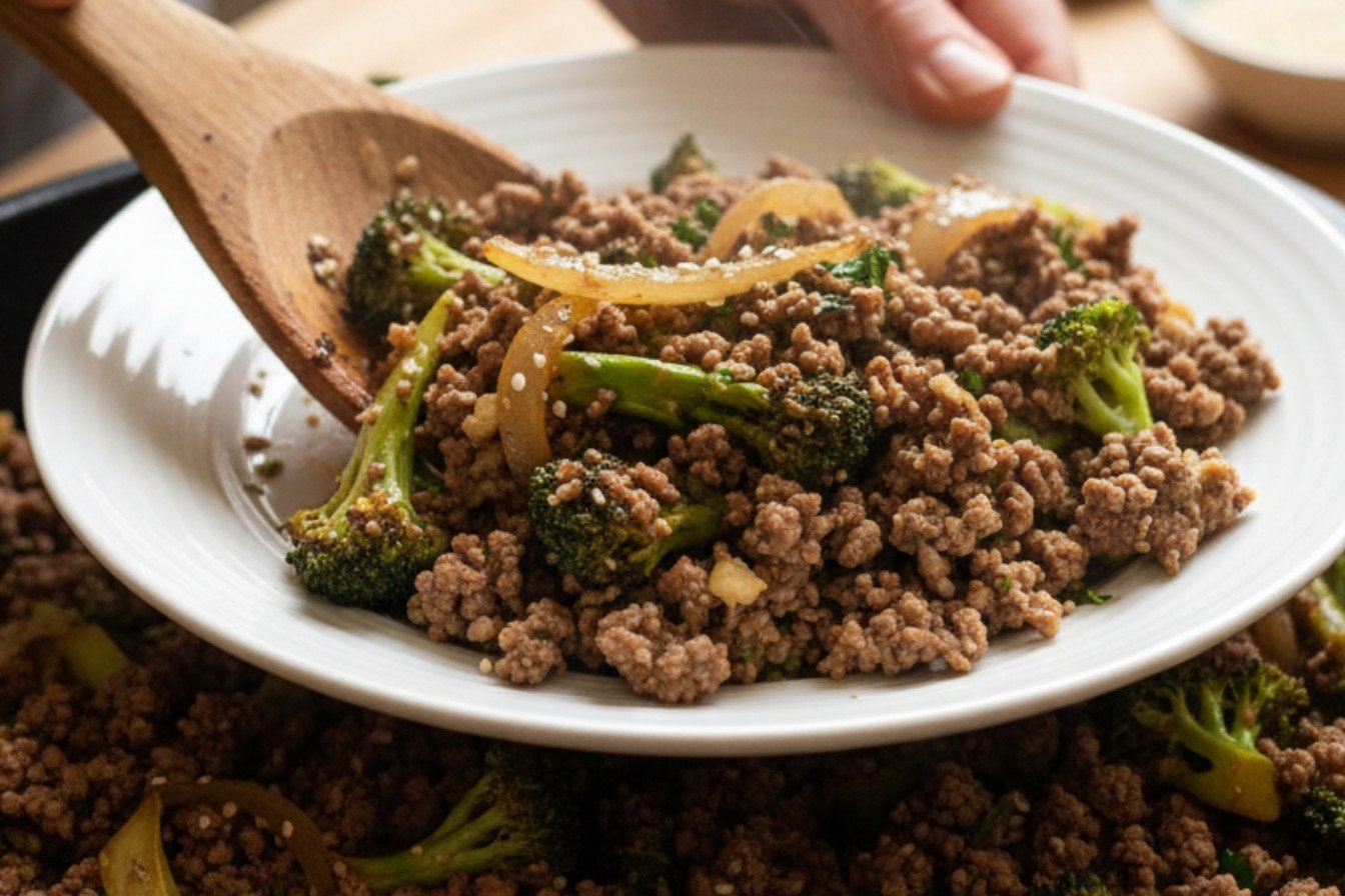 A fast and flavorful ground beef and broccoli stir-fry, seasoned with aromatic spices and ready in minutes.