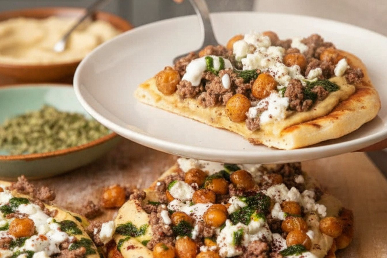 A Mediterranean-inspired flatbread pizza featuring a spiced ground meat filling, creamy hummus, tangy feta, and crispy chickpeas, all drizzled with lemon yogurt and cilantro oil.