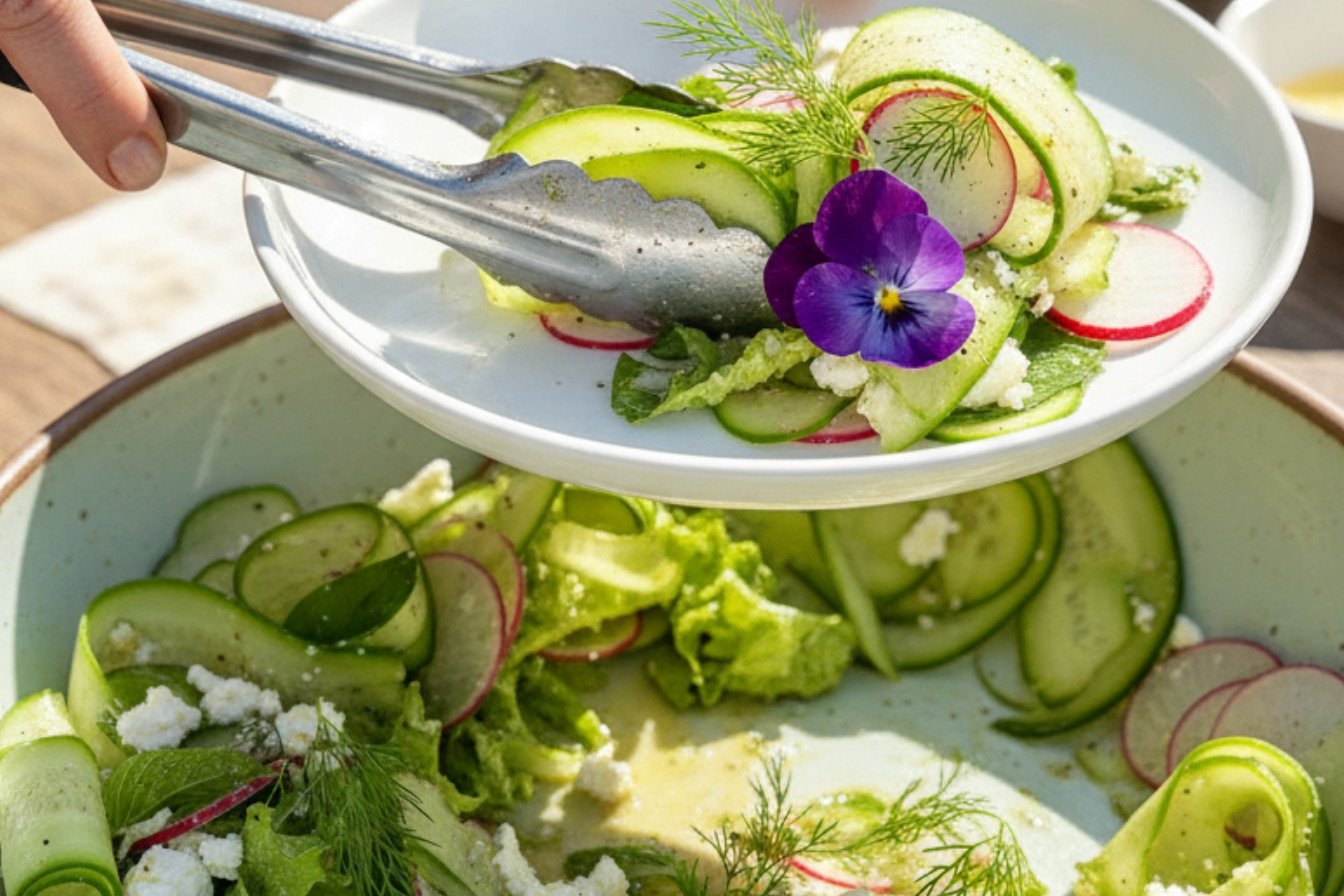 A light, crisp, and refreshing salad featuring thinly sliced cucumber and radish ribbons, tossed in a simple honey-dill vinaigrette.