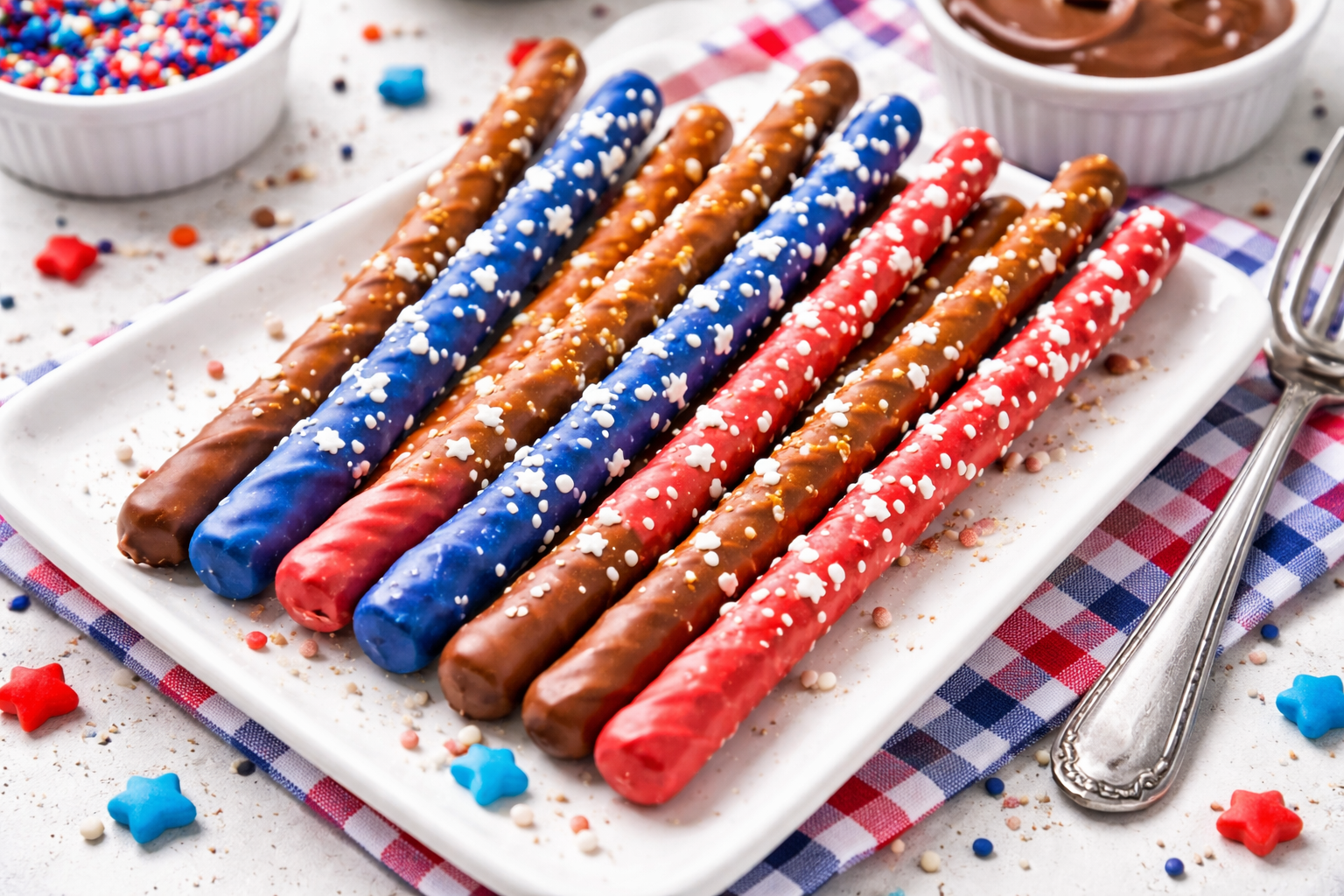 Serve these pretzel rods on a patriotic platter. Add fresh berries for a pop of color. Pack them in cellophane bags as party favors.