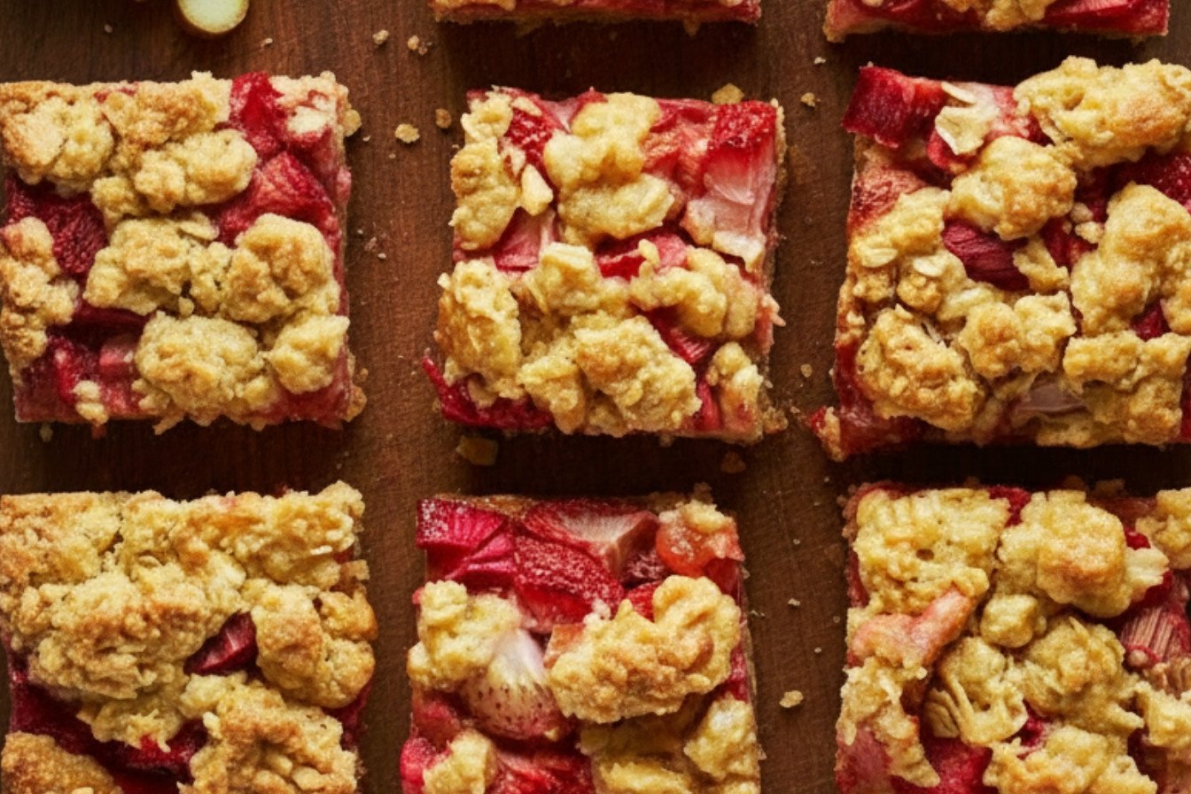 Enjoy the classic spring flavors of sweet strawberries and tart rhubarb in these easy-to-make crisp bars, featuring a buttery oat crumble crust and topping.