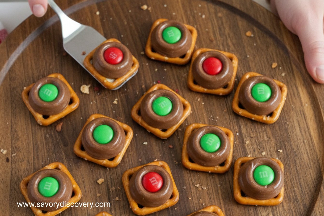 Step 4: Take the tray out. Quickly press a mini candy into each soft kiss. The chocolate will puff up around it. Be gentle so you don’t break the pretzel. Then, let them chill in the fridge until firm.