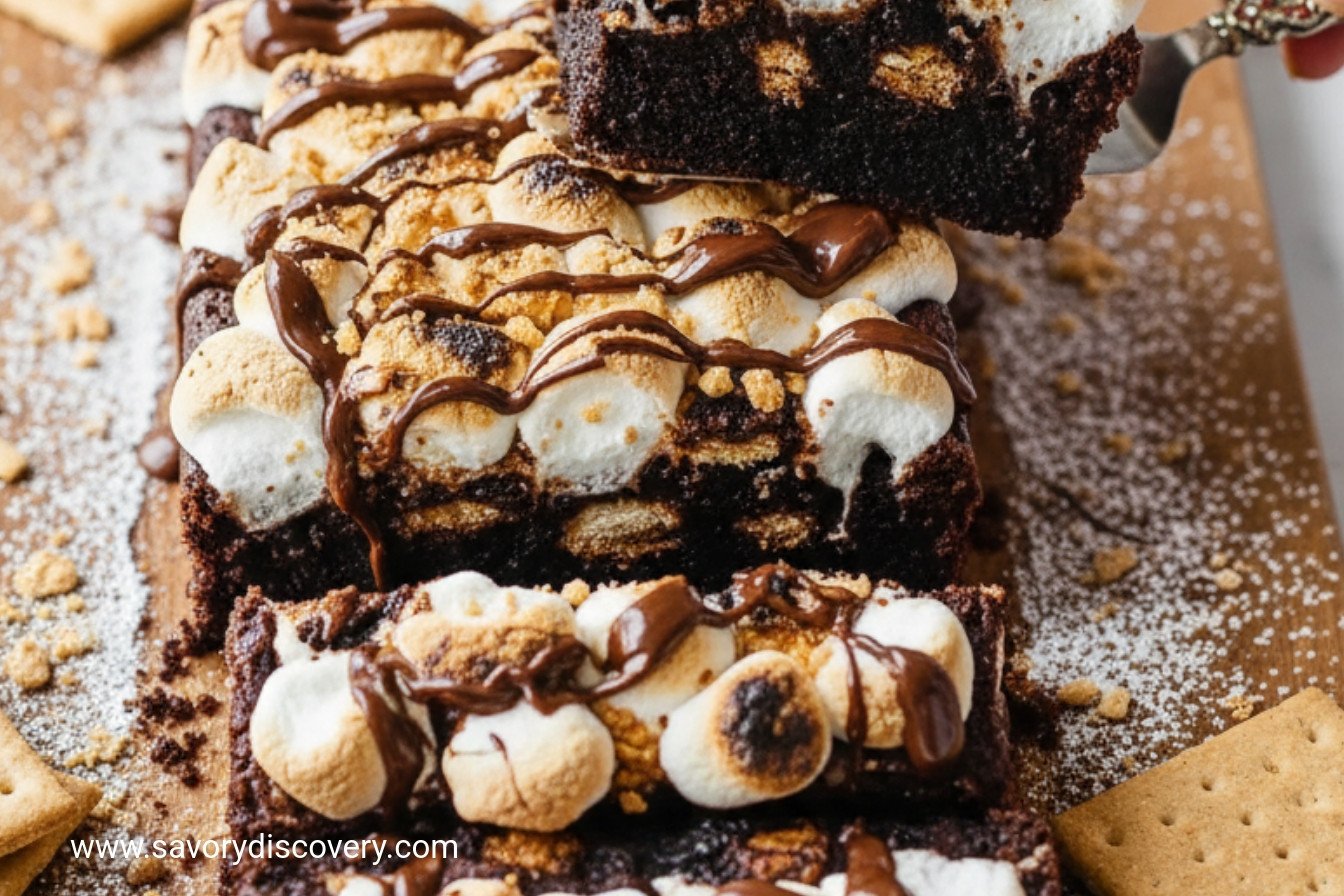 A festive and decadent dessert combining rich fudge brownies with classic s’mores toppings of graham crackers, marshmallows, and milk chocolate.