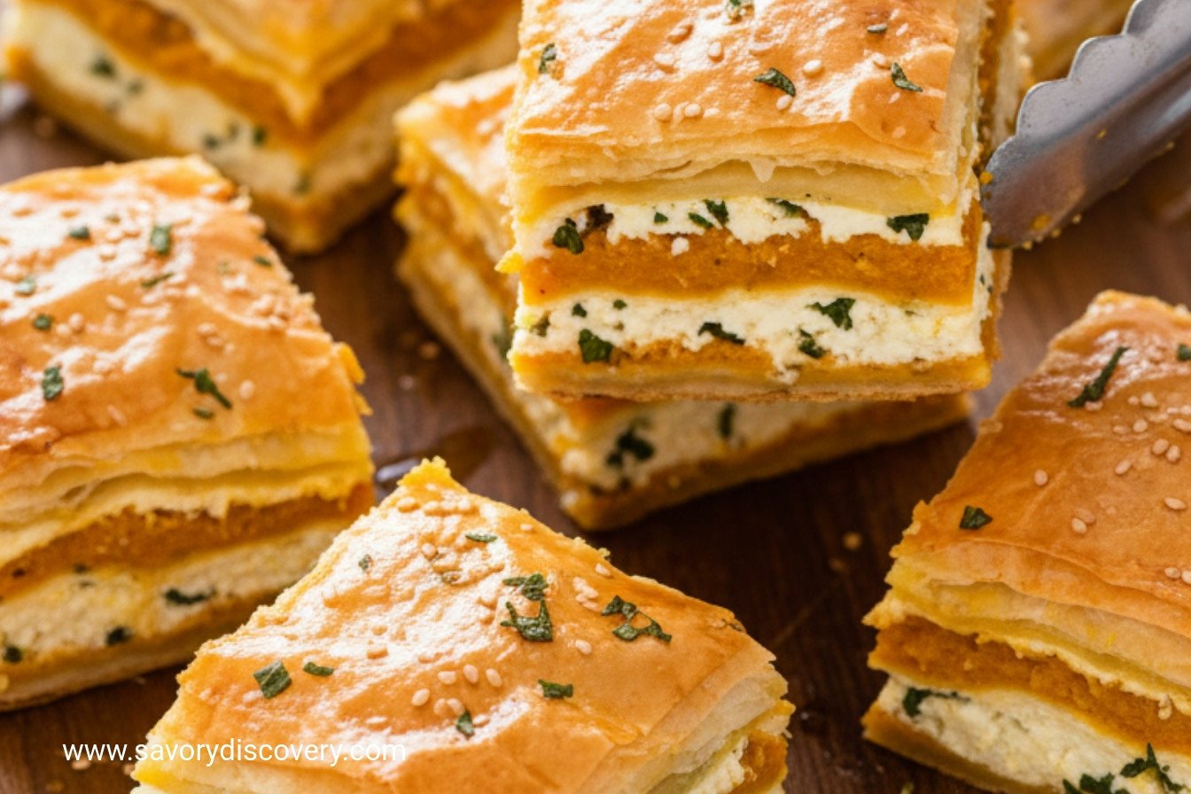 A rich, savory layered pastry filled with spiced pumpkin, halloumi, and cottage cheese, perfect for holiday gatherings.