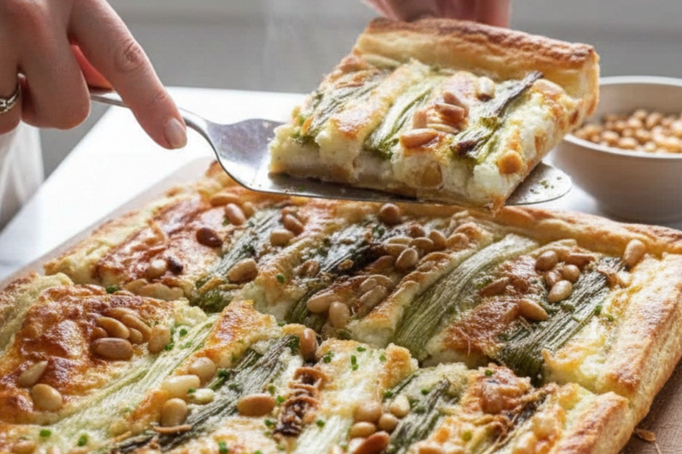 A savory and elegant tart featuring creamy goat cheese and fresh green onions on a flaky puff pastry crust, topped with Parmesan and toasted pine nuts.