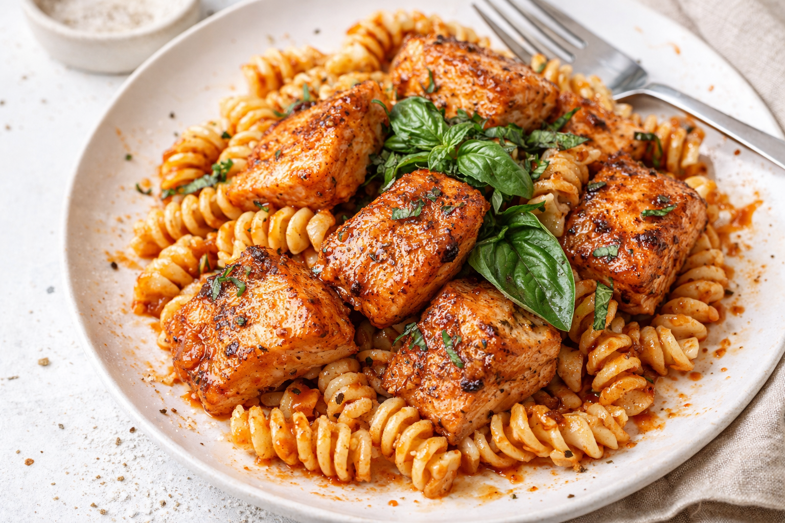 Step 1 Boil salted water for the rotini. Cook until al dente. Save ½ cup pasta water. Drain and set aside. (Hard-learned tip: Undercook pasta by 1 minute—it finishes in the sauce.) Step 2 Mix paprika, garlic powder, salt, pepper, and red pepper flakes. Coat salmon evenly. Let it sit 5 minutes for flavor. Step 3 Heat olive oil in a skillet. Sear salmon 2–3 minutes per side. Don’t crowd the pan. Remove when golden. Step 4 Sauté garlic in the same pan. Add tomato paste. Cook until darker. Stir in cream and whisk smooth. Step 5 Off heat, add parmesan, salt, and pepper. Stir until melted. Toss in basil. Fold pasta into sauce. Step 6 Add reserved pasta water slowly. Top with salmon. Garnish with parsley and extra cheese. Serve hot. What’s your go-to pasta shape for creamy sauces? Share below! Cook Time: 20 minutes Total Time: 30 minutes Yield: 4 servings Category: Dinner, Pasta3 Twists on This Weeknight Winner