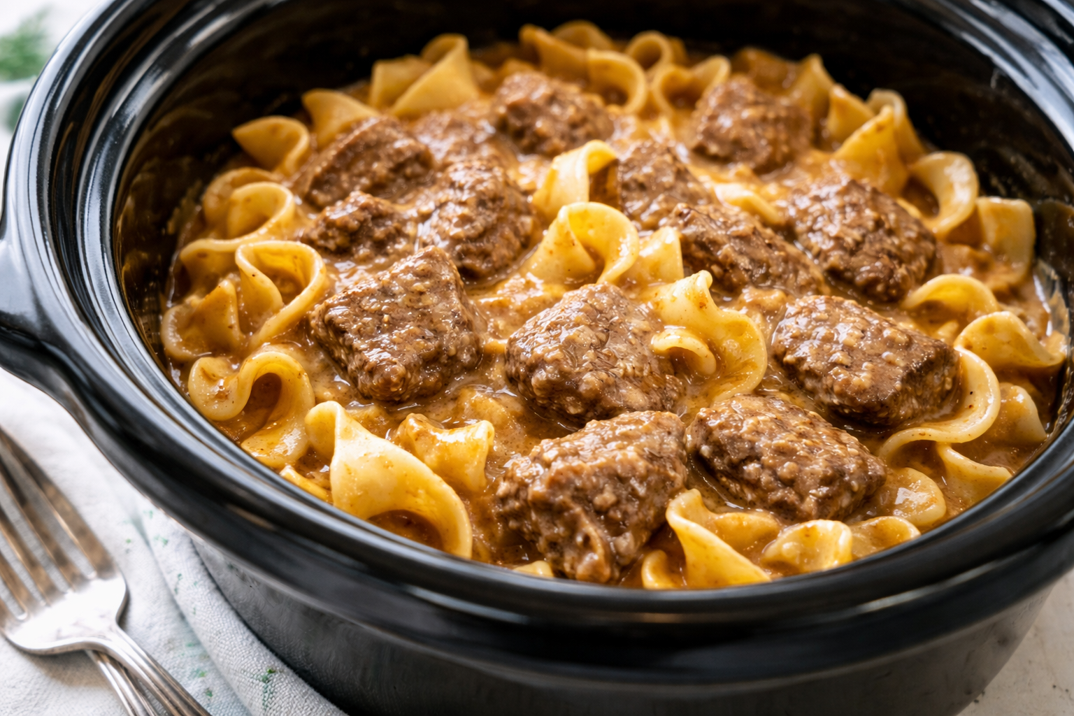 A comforting and easy slow-cooked beef stroganoff with tender beef, rich gravy, and egg noodles.