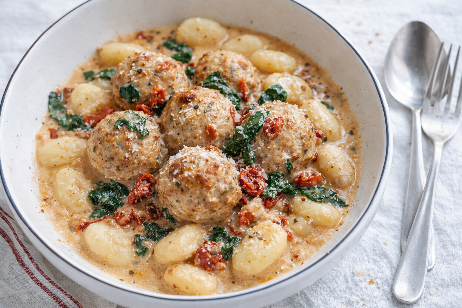 Enjoy tender chicken meatballs and soft gnocchi in a creamy Tuscan-inspired sauce with sun-dried tomatoes and spinach.
