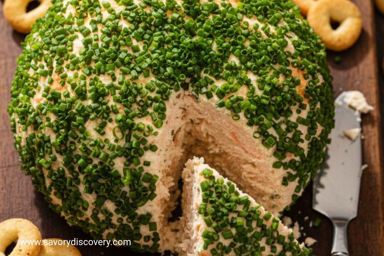 A creamy, savory cheese ball featuring smoked salmon, dill Havarti, and fresh chives, perfect for holiday gatherings.