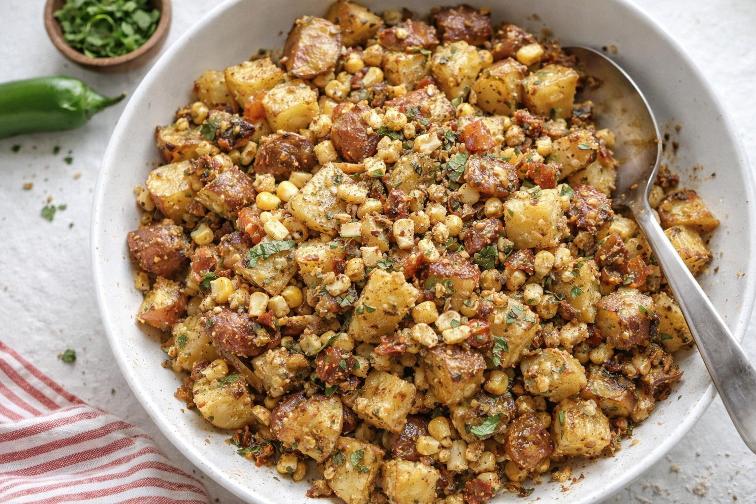 Step 1 Preheat your oven to 425°F. Line a sheet pan with parchment paper. Spray it lightly with nonstick spray. This keeps the potatoes from sticking. (Hard-learned tip: Don’t skip the parchment—cleaning burnt potato bits is no fun.) Step 2 Toss cubed potatoes with oil and spices. Coat them evenly for maximum flavor. Spread them on the prepared pan. Roast until golden and crisp, stirring halfway. Step 3 Mix corn, onion, and jalapeño with oil. Scatter over potatoes after 30 minutes. Roast another 15–20 minutes. Let everything cool slightly before mixing. Step 4 Whisk mayo, hot sauce, mustard, and spices. Gently fold in roasted veggies and half the bacon. Top with remaining bacon and cilantro. What’s the best way to test if potatoes are fully roasted? Share below! Cook Time: 45 minutes Total Time: 1 hour 5 minutes Yield: 8 servings Category: Side Dish, Picnic3 Twists on This Potato Salad
