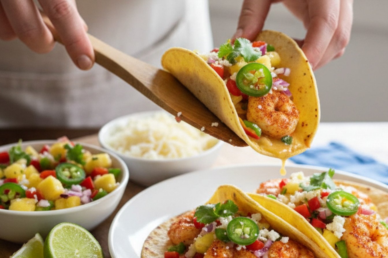 Now for the fun part. Lay out your warm tortillas. Add a few shrimp and a sprinkle of cheese. Then, pile on that bright pineapple salsa. The colors make me so happy. Every bite is a mix of warm, cool, sweet, and savory.
