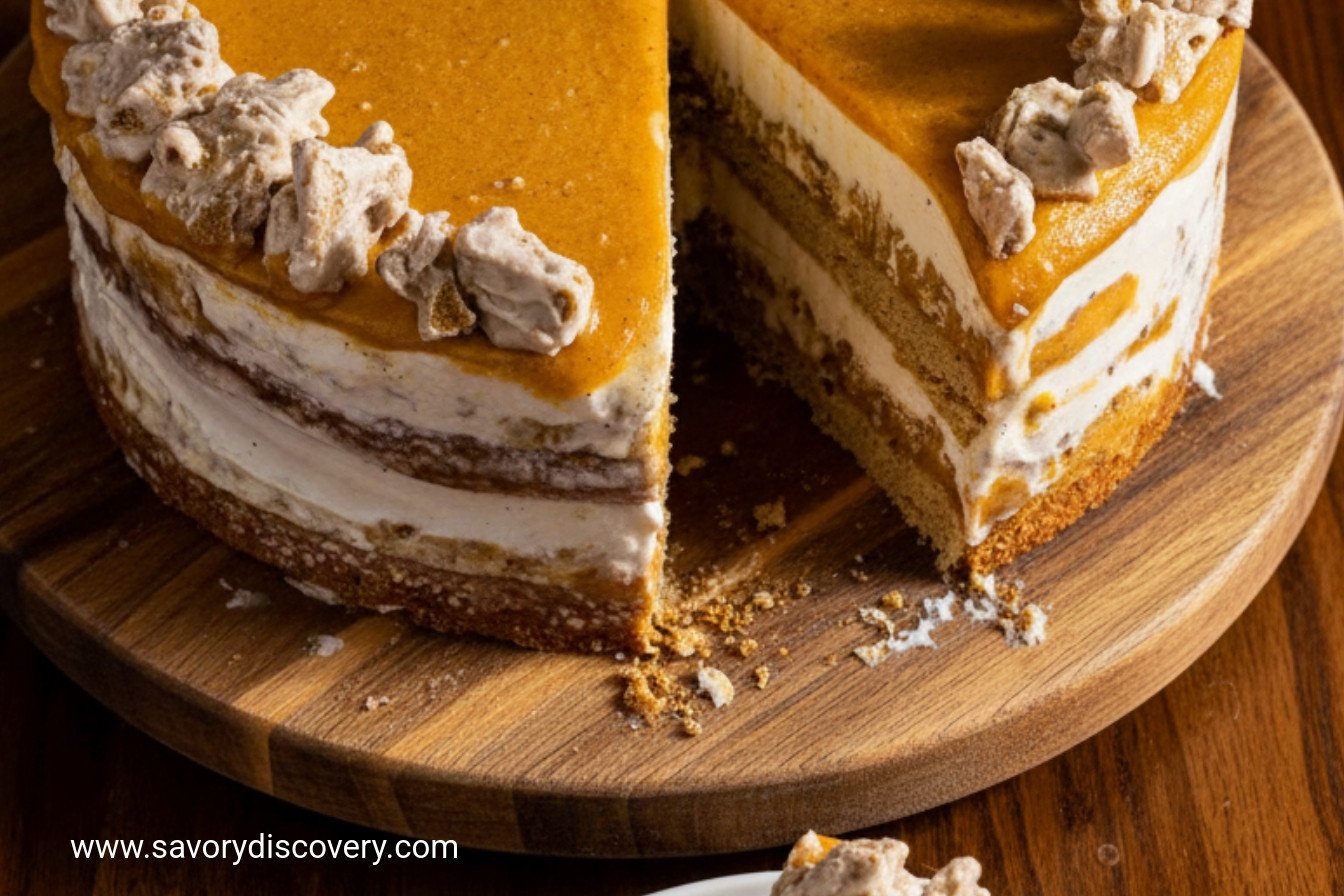 Hello, my dear. Come sit. Let’s talk about a special cake. This one is like a cozy autumn day turned into a dessert. It has soft pumpkin blondies and spicy gingersnaps. It is filled with cool, creamy ice cream.