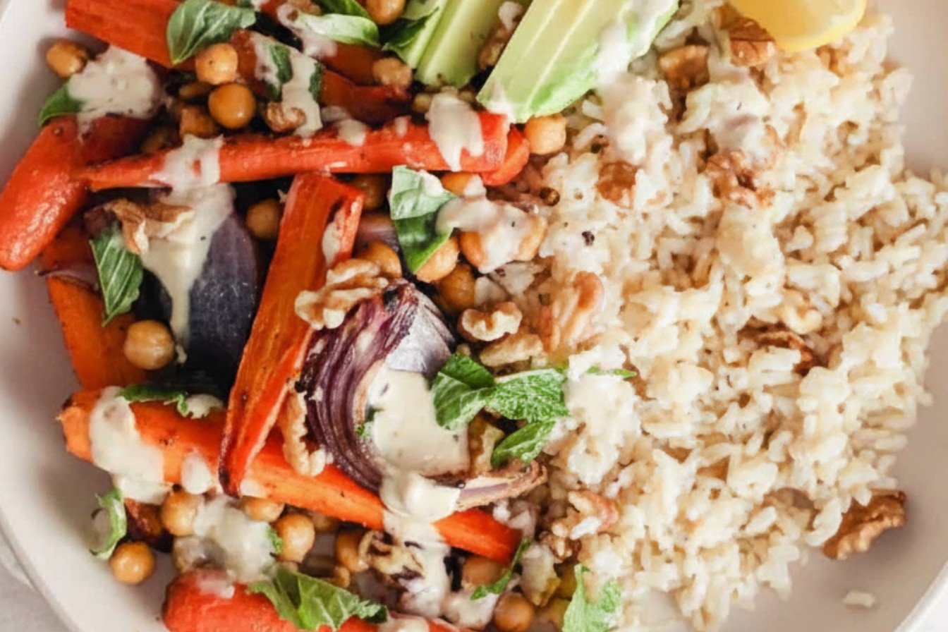 Vegetarian Rice Bowls with Roasted Carrots and Chickpeas