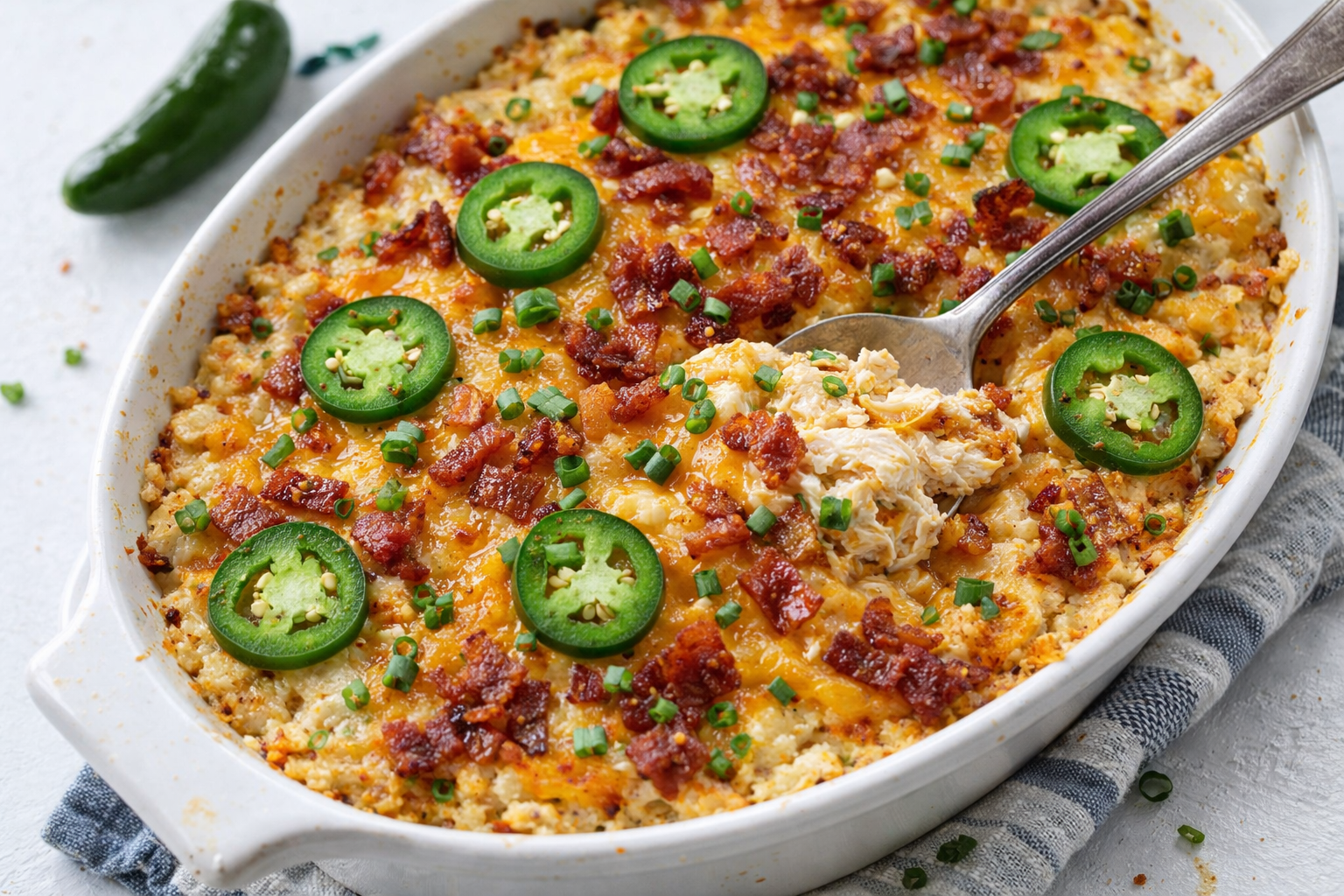 A creamy, spicy, and cheesy chicken bake loaded with jalapeños and bacon.