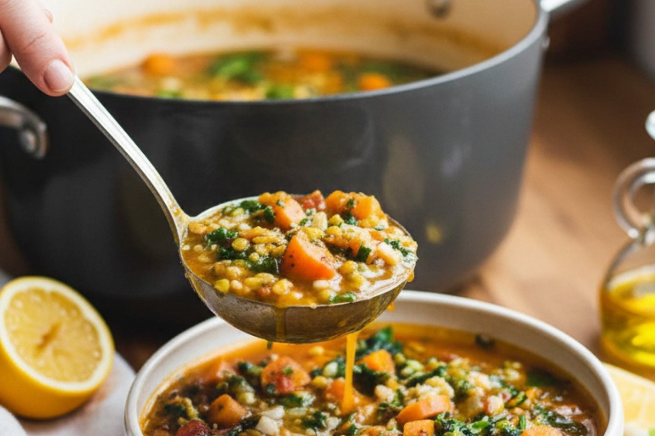 A hearty and nutritious soup packed with vegetables, red lentils, and warm spices, perfect for a comforting meal.
