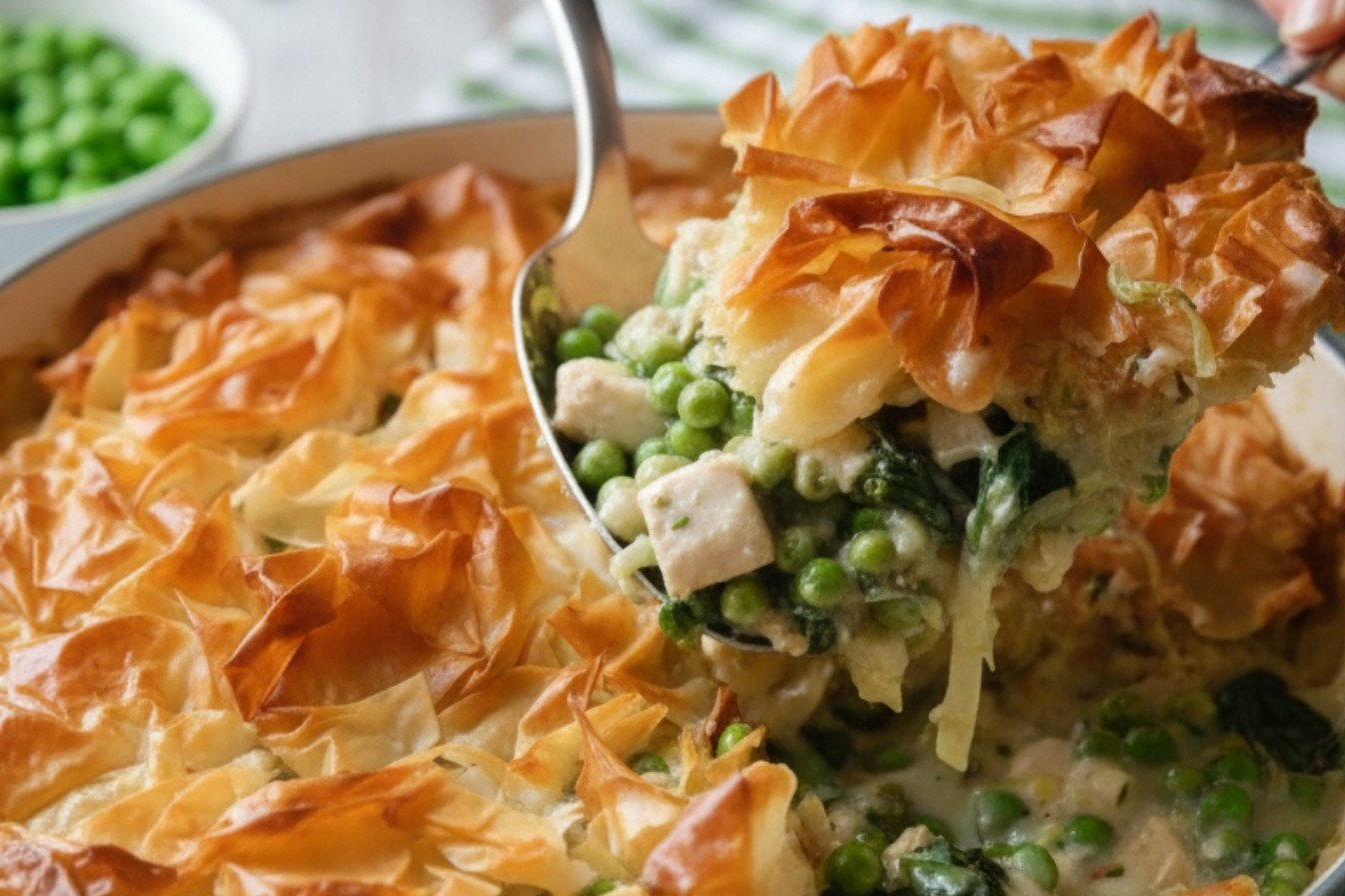 A comforting and vibrant springtime classic, featuring a creamy chicken and vegetable filling topped with a golden, flaky phyllo crust.