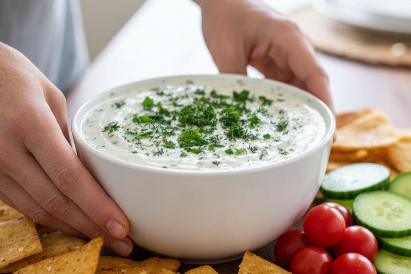 …Cucumber Cooler: Stir in half a cup of finely grated cucumber. It makes this healthy Greek yogurt dip extra refreshing. …Lemon Zest Sparkle: Add the zest of one lemon. It brightens up this fresh herb dip beautifully. …Spicy Kick: Mix in a pinch of cayenne or red pepper flakes. It gives your homemade yogurt dip a little warmth. Which one would you try first? Comment below!Serving & Pairing Ideas