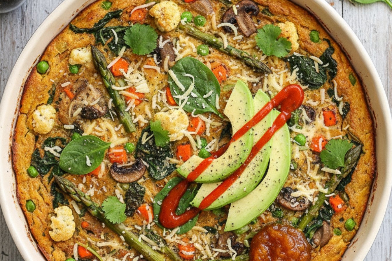 A vibrant, protein-packed vegan frittata made with a savory lentil base and spring vegetables.