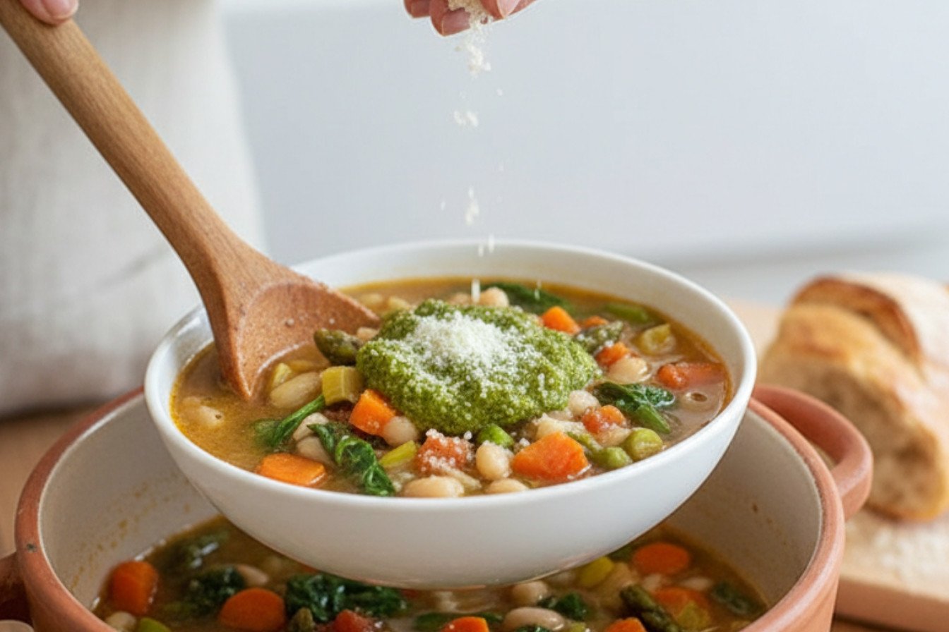 A vibrant and hearty Spring Vegetable Minestrone, simmered with leeks, carrots, asparagus, and white beans, finished with fresh pesto and Parmesan.