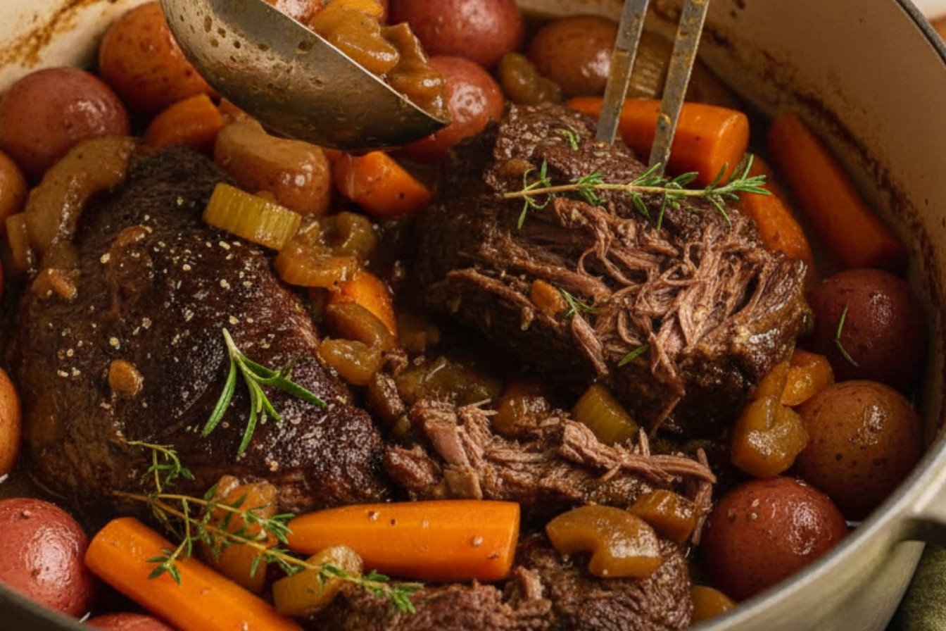 A classic, comforting pot roast braised to tender perfection with carrots, onions, and herbs in a rich red wine sauce.