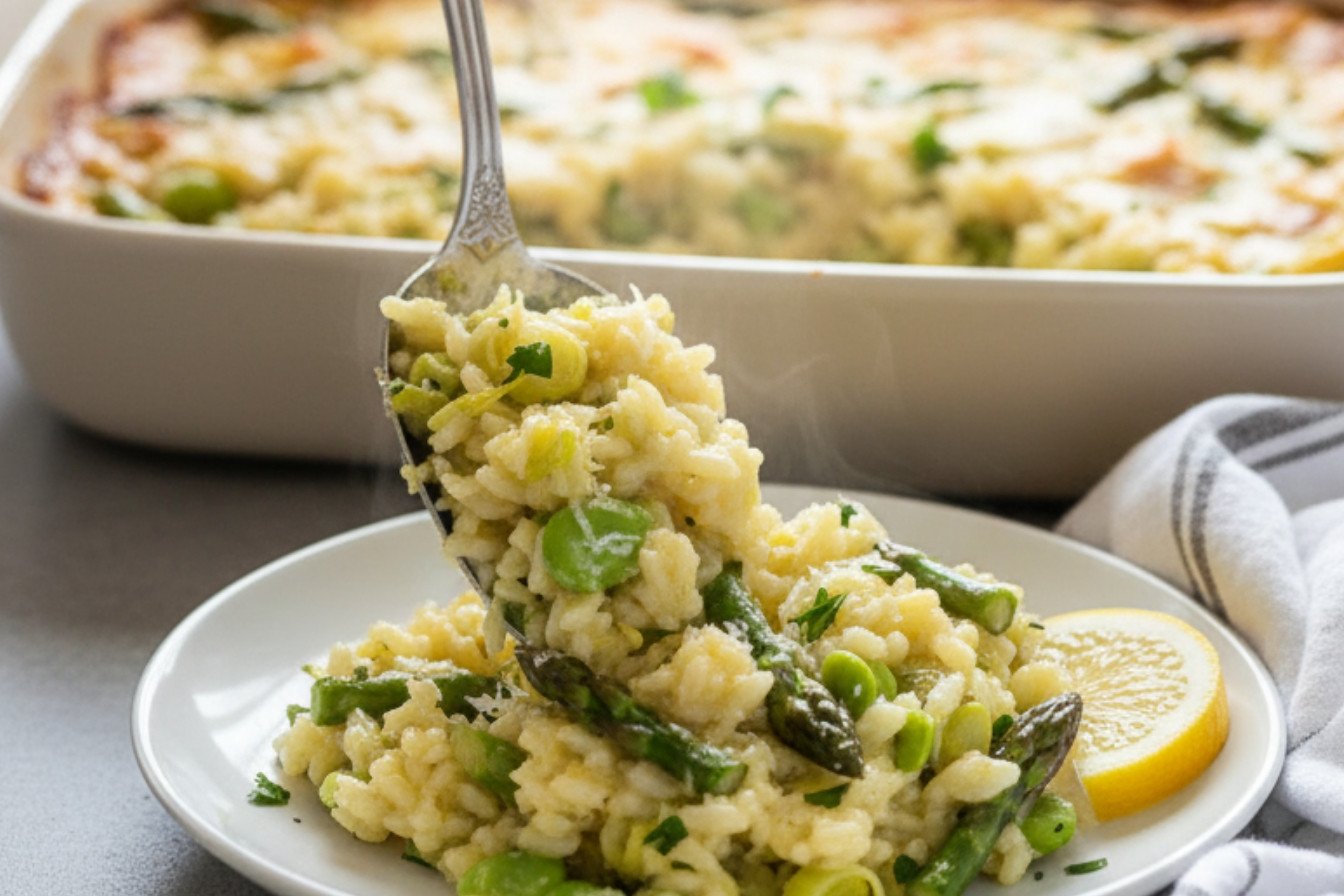 A creamy and vibrant Spring Vegetable Risotto with asparagus, leeks, and fava beans, finished with lemon and Parmesan.