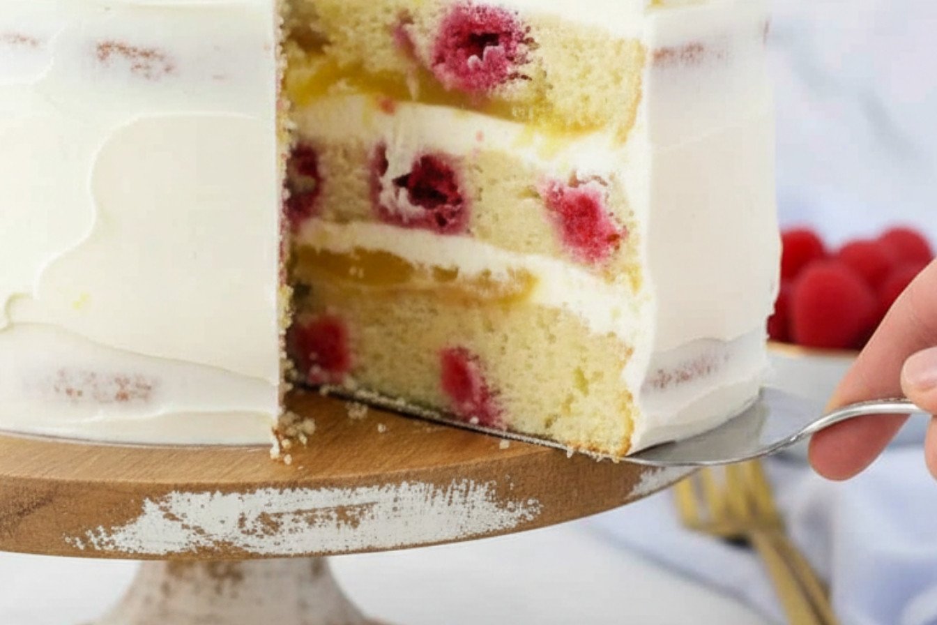 A bright and beautiful layered cake bursting with fresh lemon flavor and juicy raspberries, finished with a light mascarpone frosting.