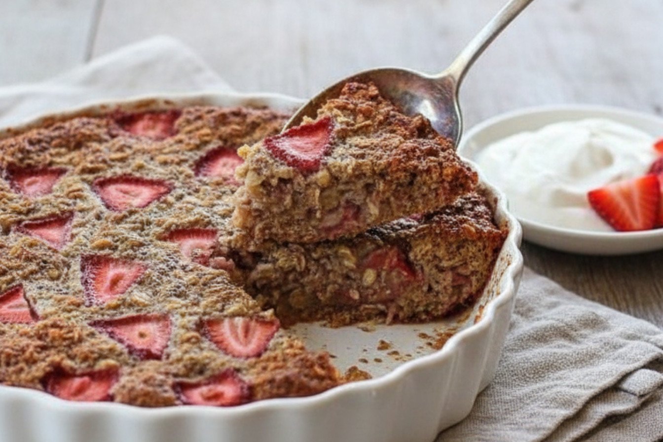 A warm and wholesome baked oatmeal packed with strawberries, chia seeds, and walnuts, perfect for a healthy breakfast or brunch.