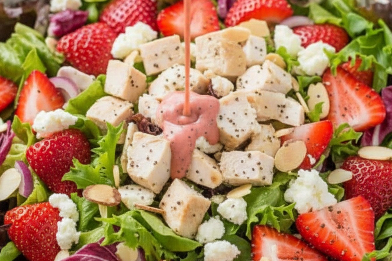 Swap chicken for grilled peaches. Their sweetness is magical with the strawberries. Use fresh mint instead of poppy seeds. It adds a cool, garden-fresh pop. Make it a wrap! Roll all the fillings in a big, soft tortilla. Which one would you try first? Comment below!